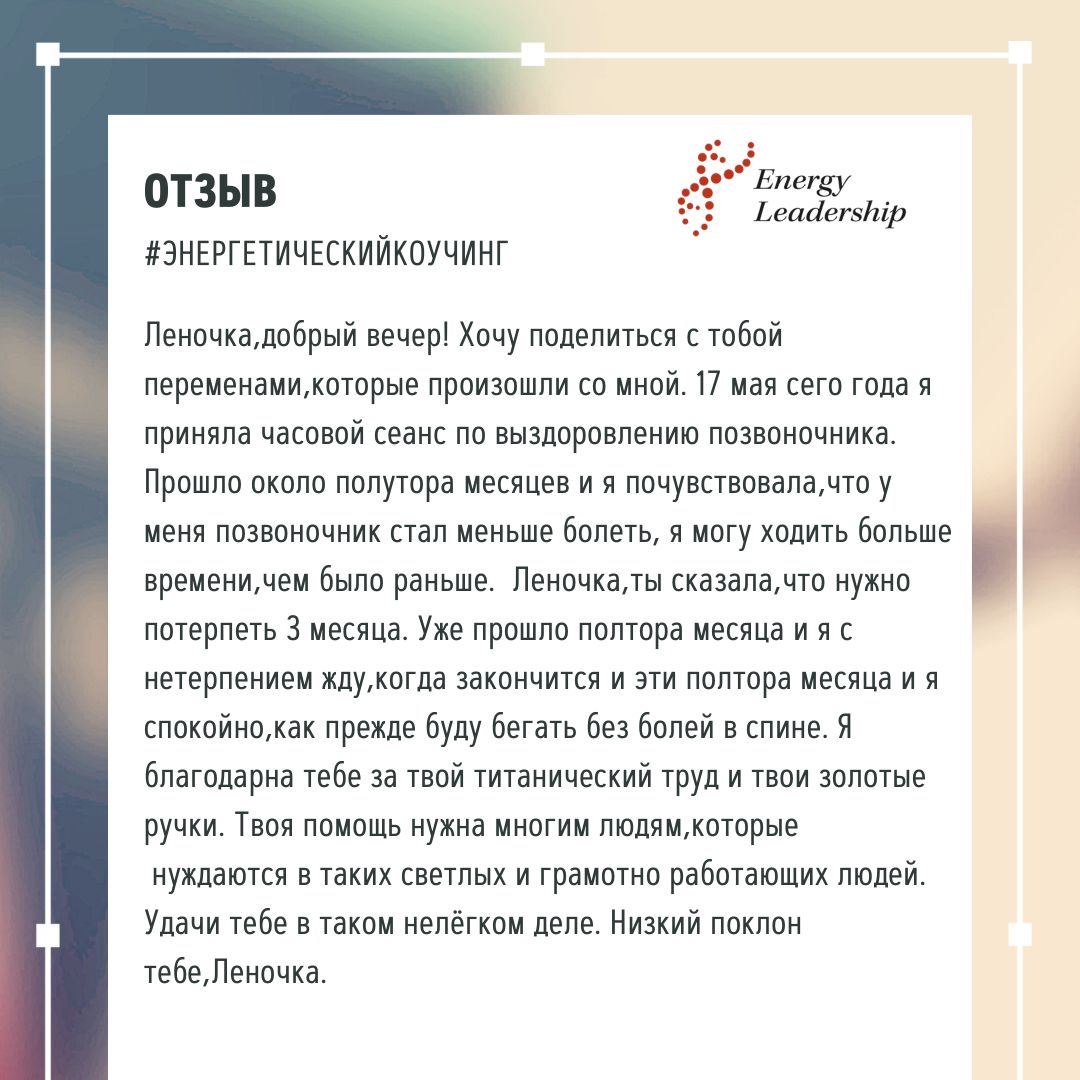 Доброе утро всем,!!!Наконец,то девочки и мальчики я реабилитировалась после нашей с Леночкой-Супер Класс Мастером совместной работы над моими проблемами с позвоночником и суставами… Мы начали сеансы по имеющейся у Леночки практике Ниа Та Нэ, получила десять сеансов, на сеансах получала воздействие сразу на три проблемных места (эта практика даёт такую возможность!), в моём случае колени ,локтевой сустав, иногда плечевой сустав руки и поясница.Уже после второго сеанса я ощутила эффект, у меня появилась бодрость, улучшилось настроение,так боли с каждым сеансом отпускали меня, на первых сеансах мне было больно переворачиваться, лежать на спине или на животе, я терпела и сама ещё просила, подключала дома энергии ,ведь у меня перед сеансами уже начинались ночные судороги, проблемы и с сосудами и грыжей …хотя сеансы были почти бесконтактные, я чувствовала, ощущала Леночкины руки, движения рук, поток целительной энергии, исходящий от её руки. так вот на 8 сеансе я уже чувствовала себя прекрасно.да ещё во время одного из сеансов Леночка ещё совместила Ниа Та Нэ с выравниванием позвоночника, супер ощущения! ,и так после 10 сеансов, я решила поехать к своему Врачу, кто лечил мою физику на повторное обследование и лечение..Так вот реакцией моего врача было удивление, что за год что я не продолжала медикаментозное лечение суставов, такой результат на коленях: исчезли остеофиты на кости и чашечке, суставы были внешне деформированы, отечные, теперь колени приняли здоровую свою форму, травмированное сухожилие(было надорванное) восстановилось, ЧУДЕСА!для него это было сюрпризом, а для меня представляете?он приветствовал работу Мастера и передал большой Привет тебе Леночка!!! воодушевился на совместное лечение своих пациентов, только сказал, что в районе где он работает необходимо будет подбирать больных с соответствующим и духовным уровнем..Дай Бог ..